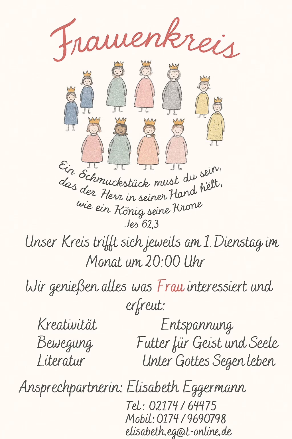 Frauenkreis: Kreativität, Bewegung, Literatur Wir laden ein zu einem Abend in Gemeinschaft. Erleben Sie mit uns Kreativität, Literatur, Entspannung und geistliche Impulse. Wann: Jeden 1. Dienstag im Monat Zeit: 20:00 Uhr Kontakt: Elisabeth Eggermann